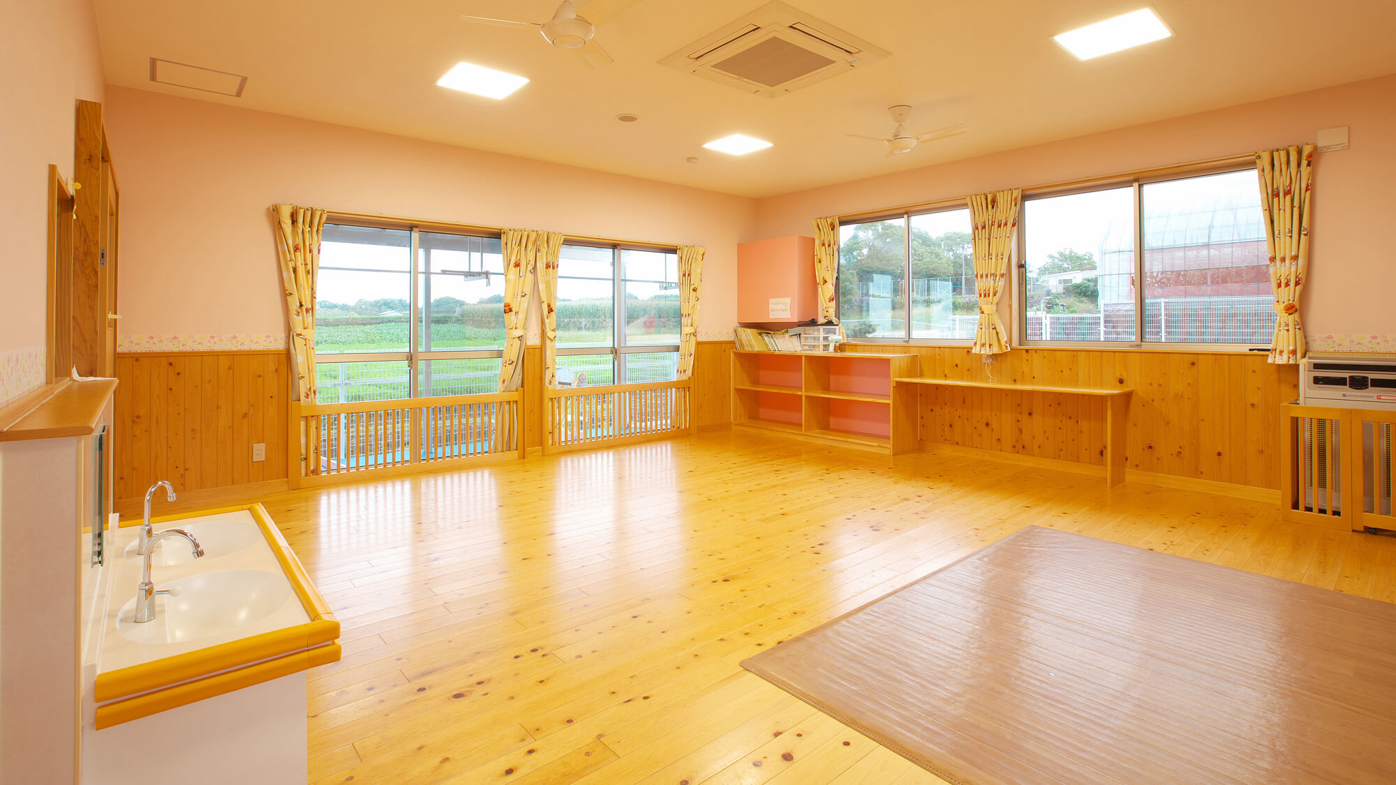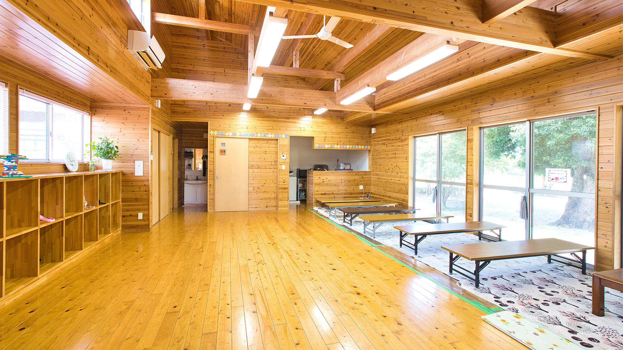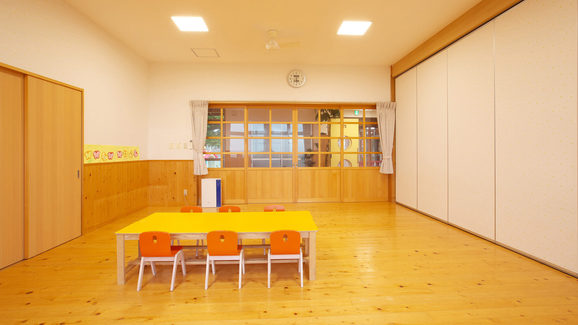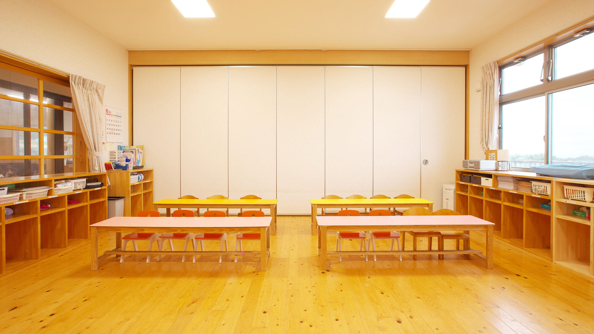 2歳児部屋と同様に見晴らしが抜群です。リズム遊びや体育をする時には仕切り壁を移動し3クラス分の広い部屋にすることで、のびのびと動きまわることができます。