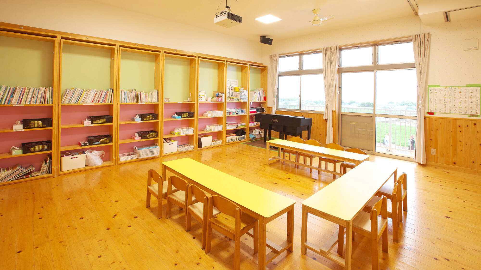 この部屋も見晴らしがよく、ピアノが設置されておりリズム遊びをする時に活躍しています。さらに、お遊戯会や卒園式の時にはこの部屋の棚を移動することで舞台になります。