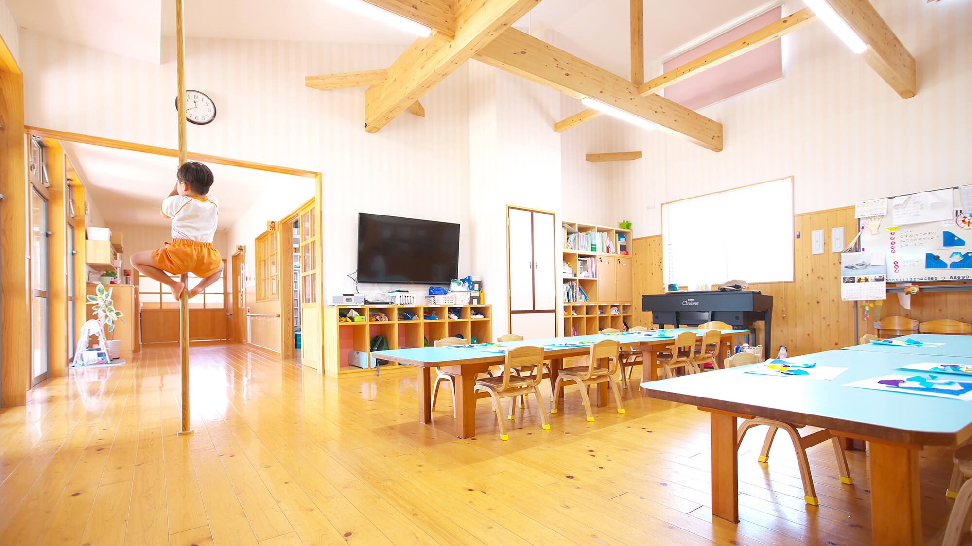帰りの時間には仏様がいらっしゃるこの部屋に集まり合掌するなど、生活の中に仏教教育が根付いています。 また、この部屋には登り棒が設置されており、雨の日でもこどもたちが元気に登っています。