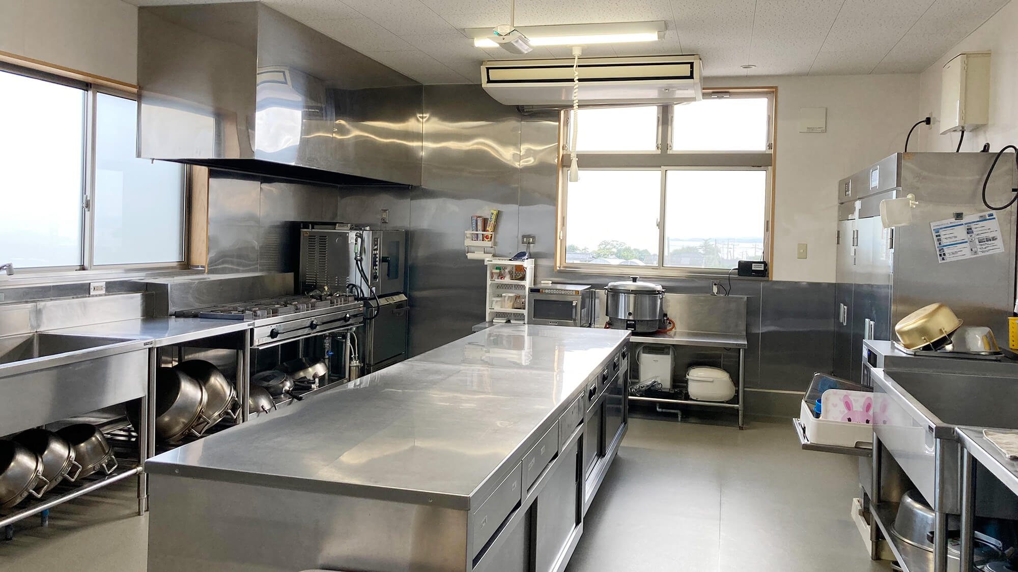開放的で広いスペースの給食室には、食中毒を予防する急速冷却機ブラストチラーを装備しています。充実した設備で、こどもたちに安全で美味しい給食を提供します。