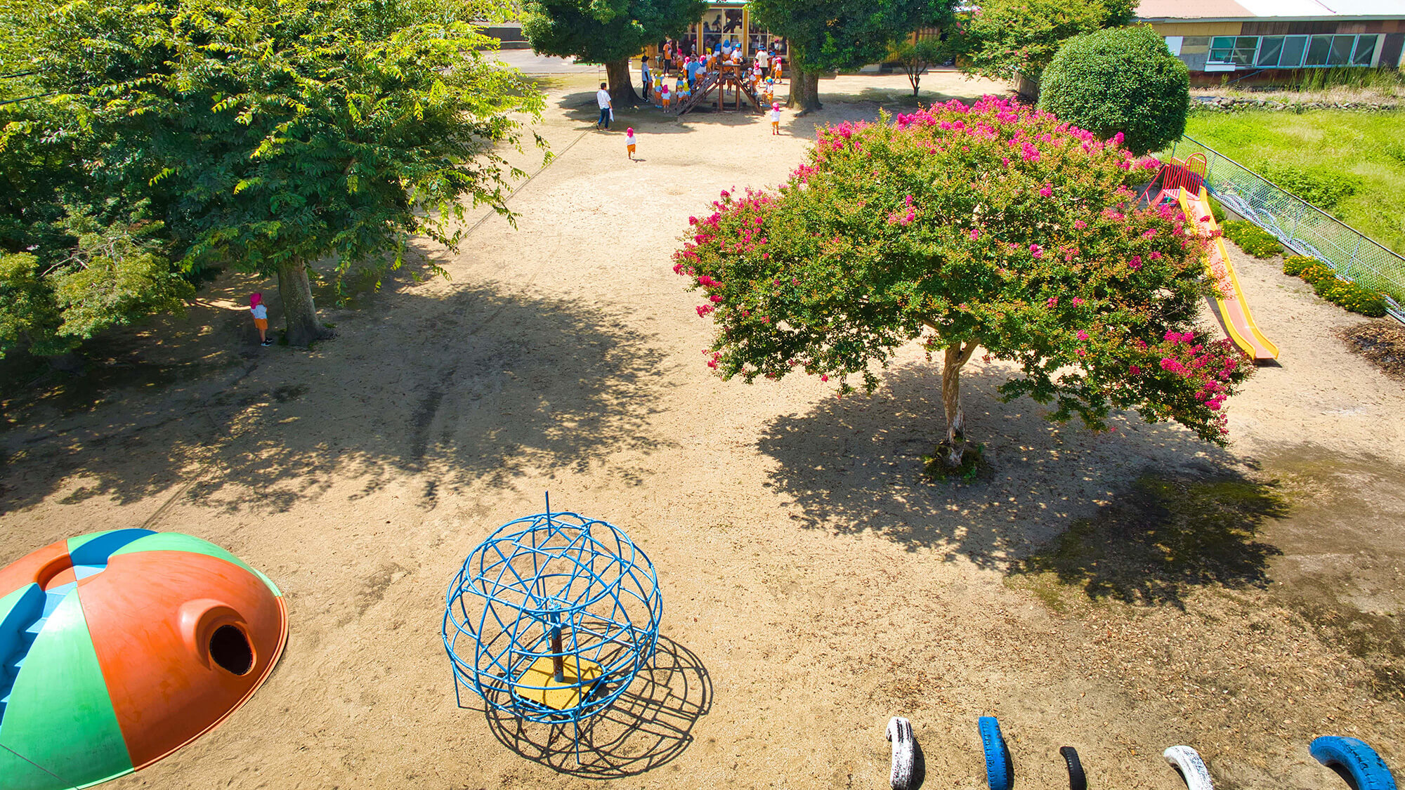 園庭には大きな木があり夏には緑がたくさん生い茂り、夏でもこどもたちは木陰の下で元気に遊ぶことができます。カラフルならせんの滑り台はこどもたちに人気の遊具です。
